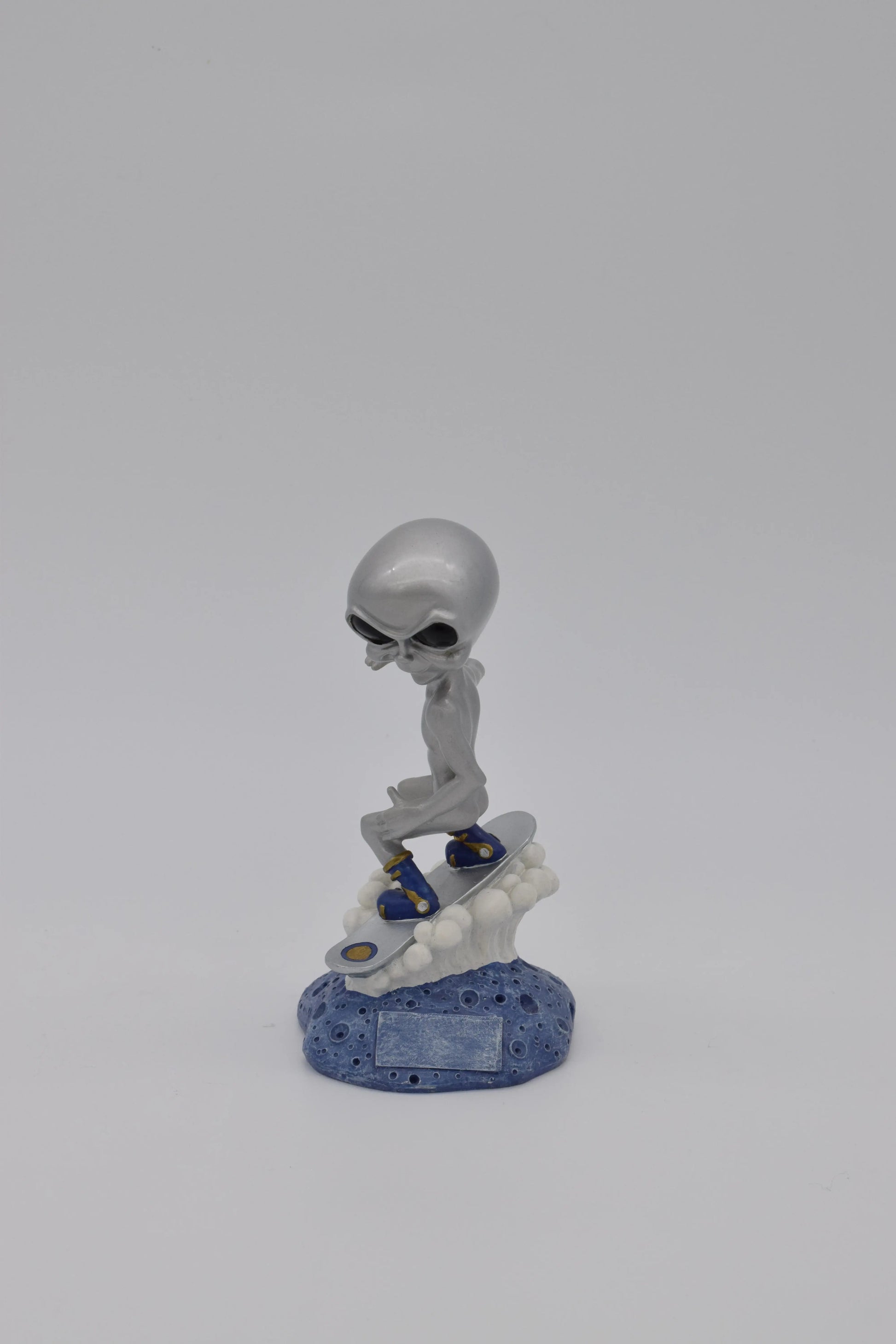 - Design: Detailreich gestalteter Alien mit silbernem Kopf und markantem Look, auf einem Surfbrett mit auffälligen goldenen und blauen Details.
