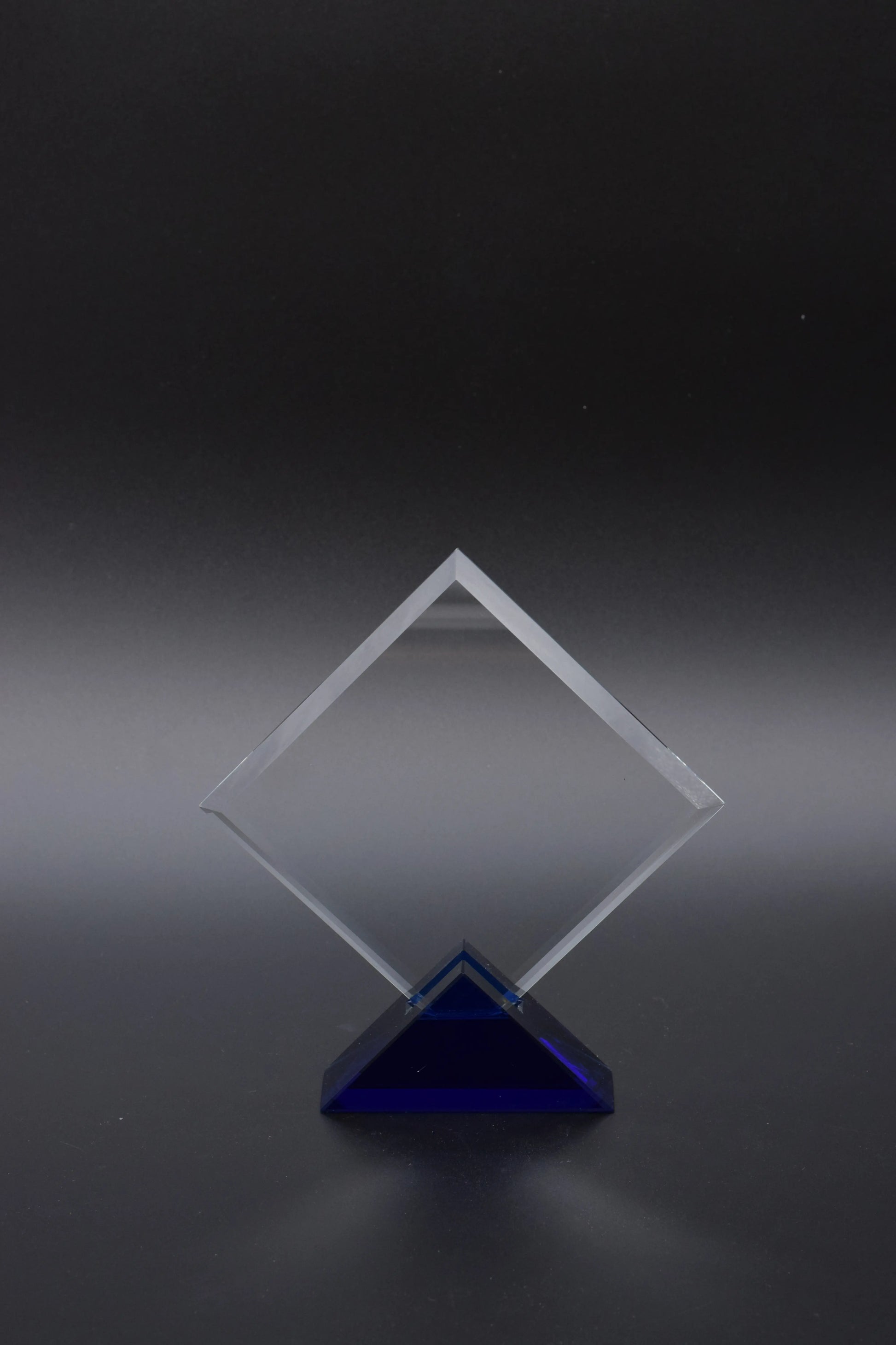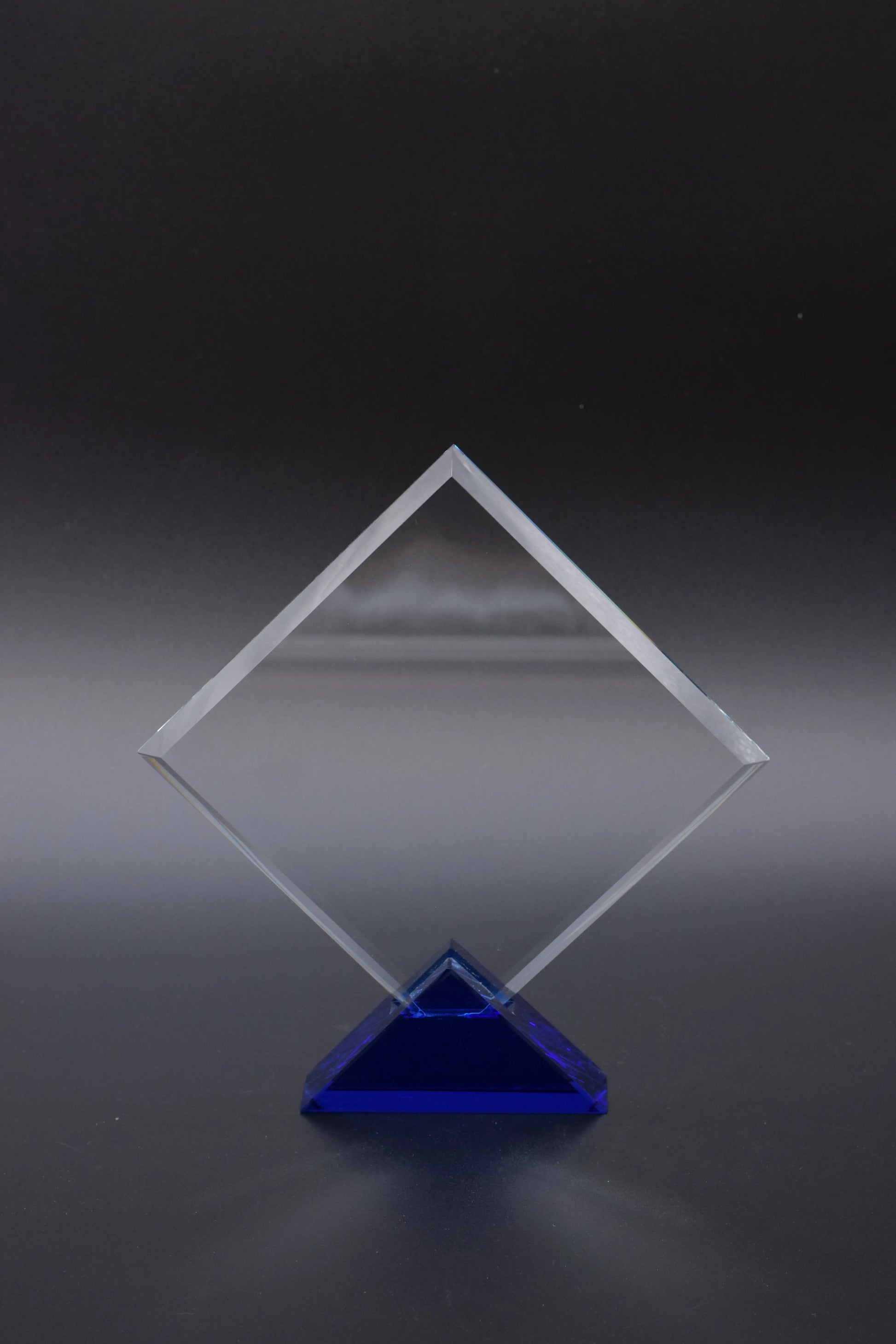 Der DiamondView Glasständer besticht durch seine kreative Rauteform und die auffällige, blaue Halterung, die ihn zu einem echten Blickfang machen. Diese Trophäe bringt Dynamik und Eleganz in jede Auszeichnung.