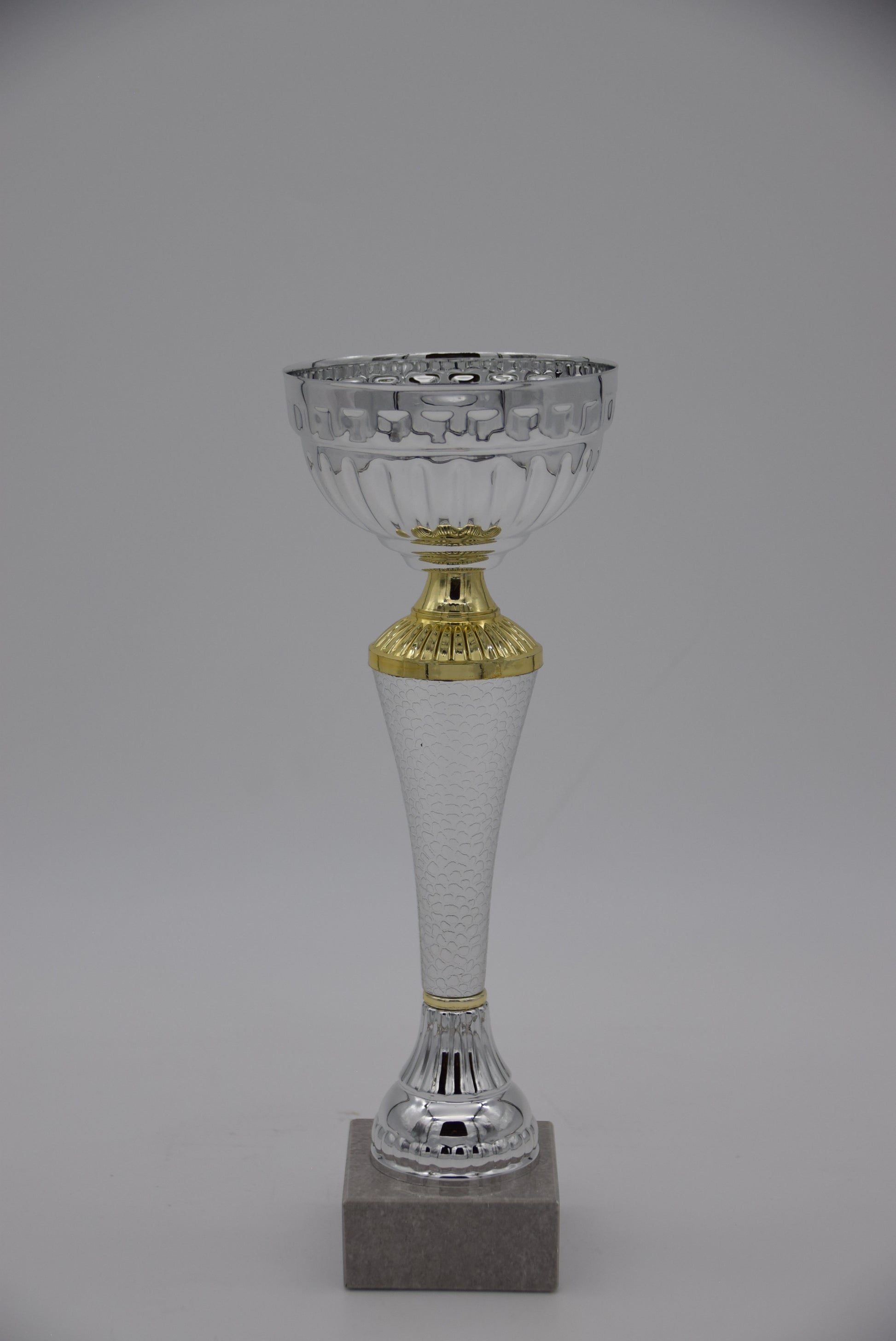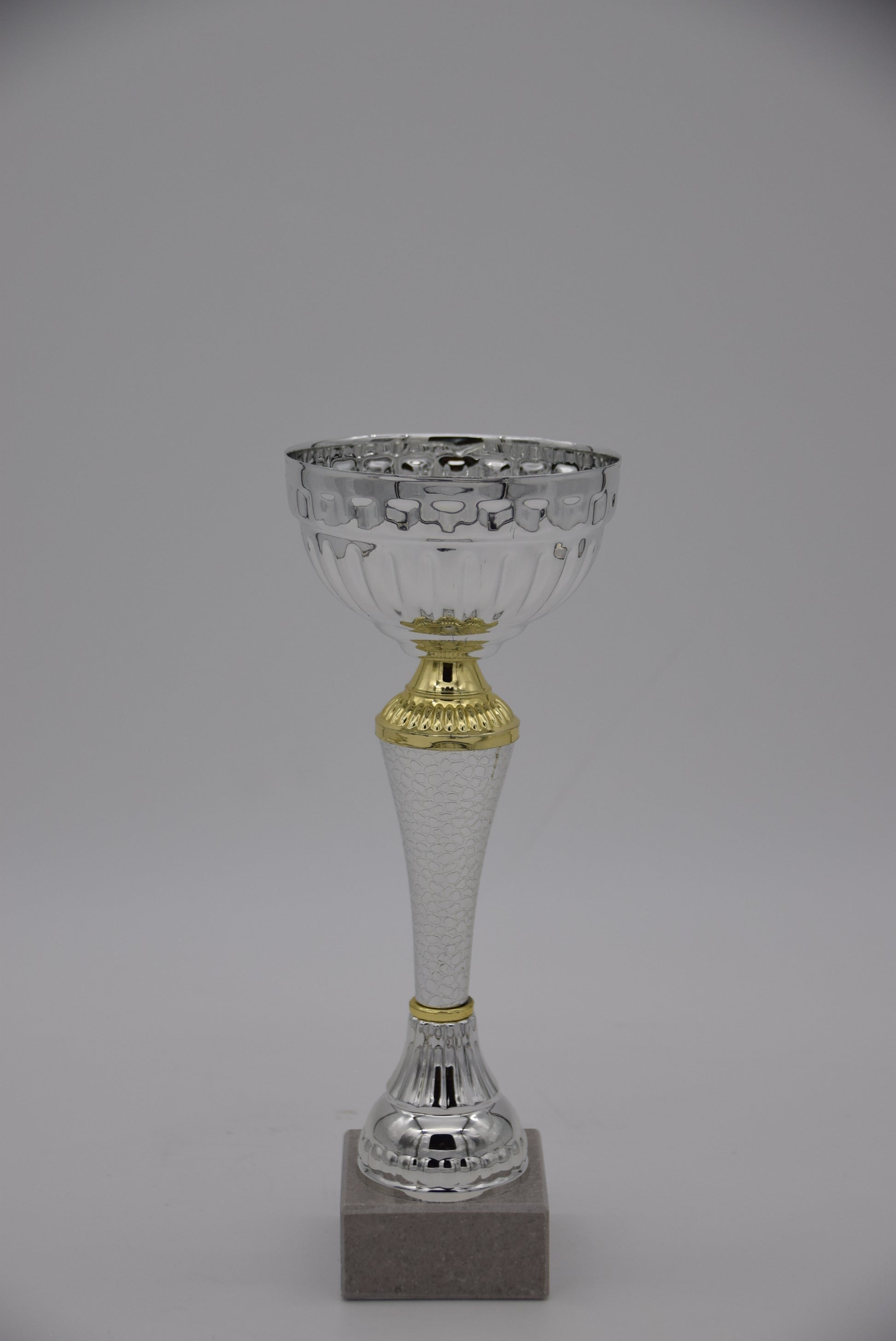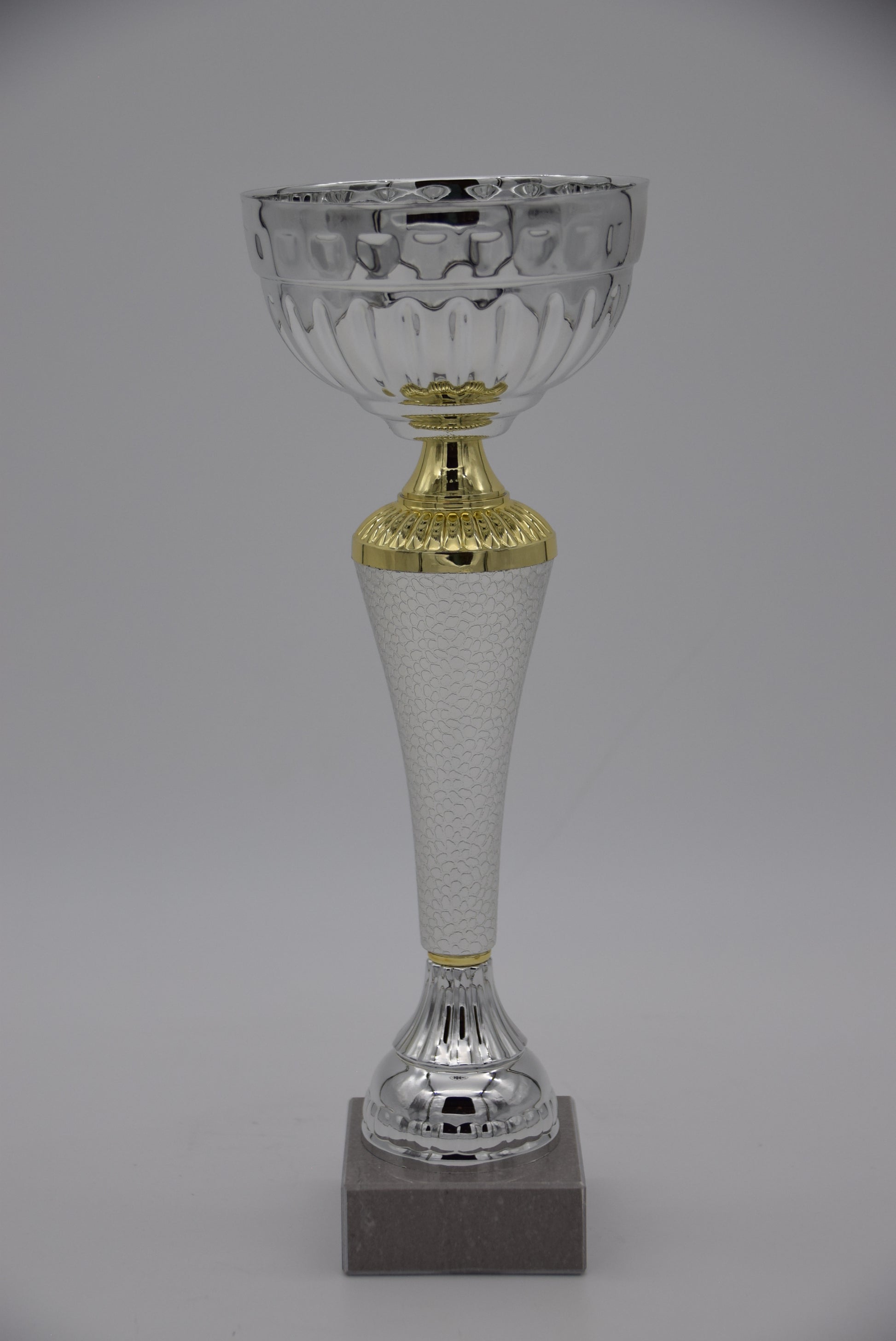 Schale: Die silberne Kelchschale im klassischen Design bildet den oberen Abschluss des Pokals und bietet Platz für individuelle Gravuren oder Beschriftungen.