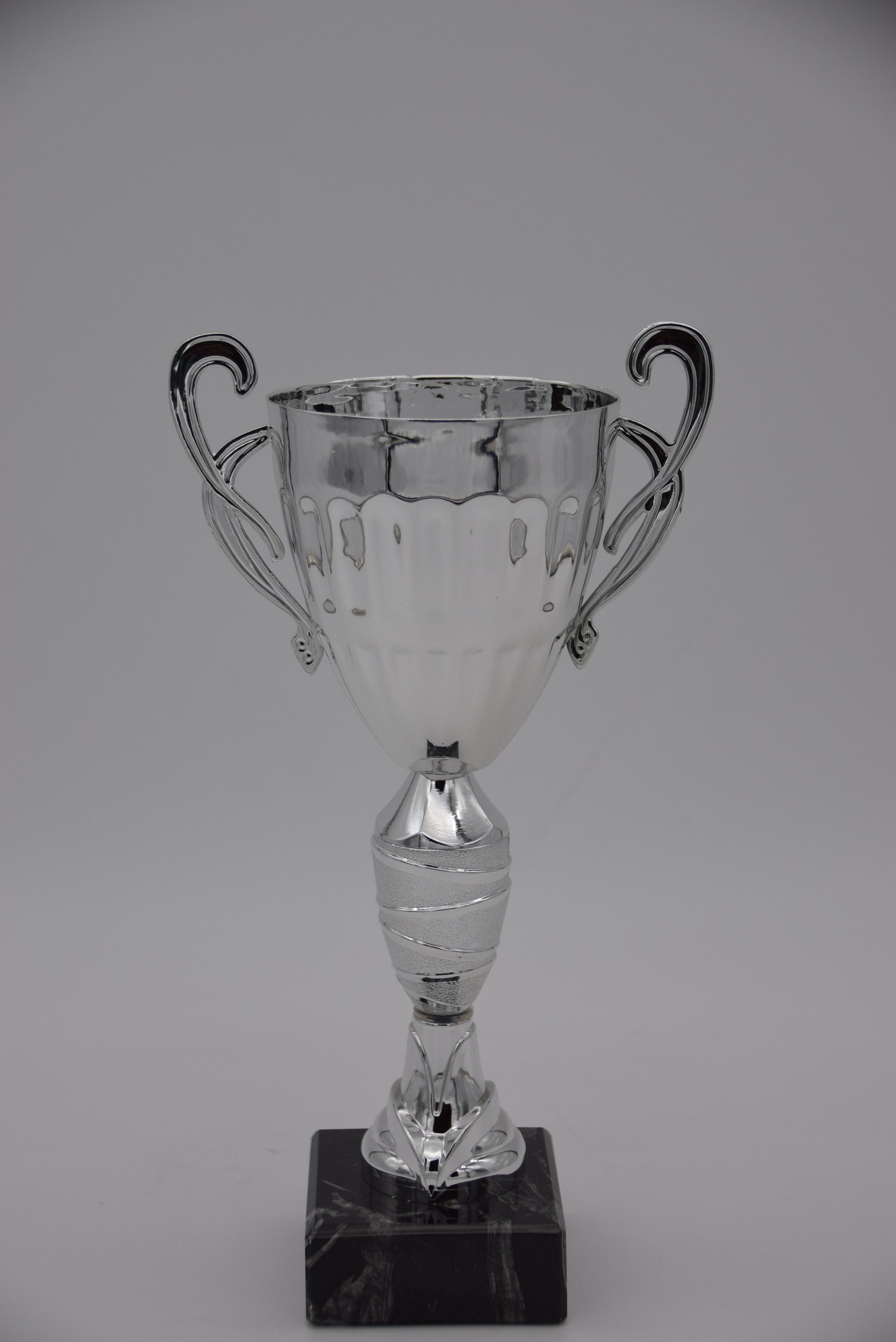 Der "Klaus Silber 24" ist ein edler silberfarbener Pokal, der durch sein klassisches Design und seine hochwertige Verarbeitung besticht. Der elegante Hauptkörper des Pokals ist mit feinen Details verziert, die das silberne Finish besonders gut zur Geltung bringen. Die geschwungenen Griffe verleihen dem Pokal eine stilvolle Note, während der stabile schwarze Sockel eine personalisierte Beschriftung ermöglicht.